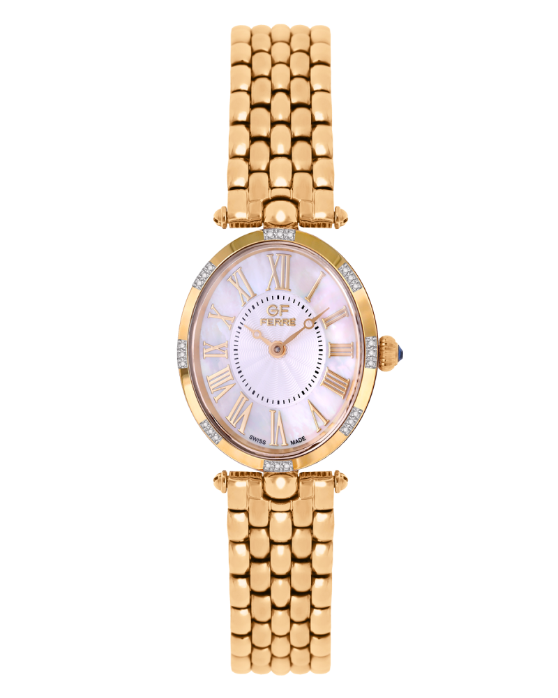 ساعة الماس نسائية ماركة جي اف فيرري صناعة سويسرية ، من الاستانلس ستيل المصقول ، بلون فضي و ذهبي ، واطار بيضاوي رقيق بقطر مقاس 28 مل ، مرصع باحجار من الألماس ، ميناء صدفي جميل بتفاصيلة ترقيم روماني ، الشعار على الميناء بشكل بارز ، الغطاء الخلفي ايضا بحروف بارزة يعكس فخامة الساعة ، الساعة مضادة للماء لخمسين مترا وتاتي بتغليف جميل
