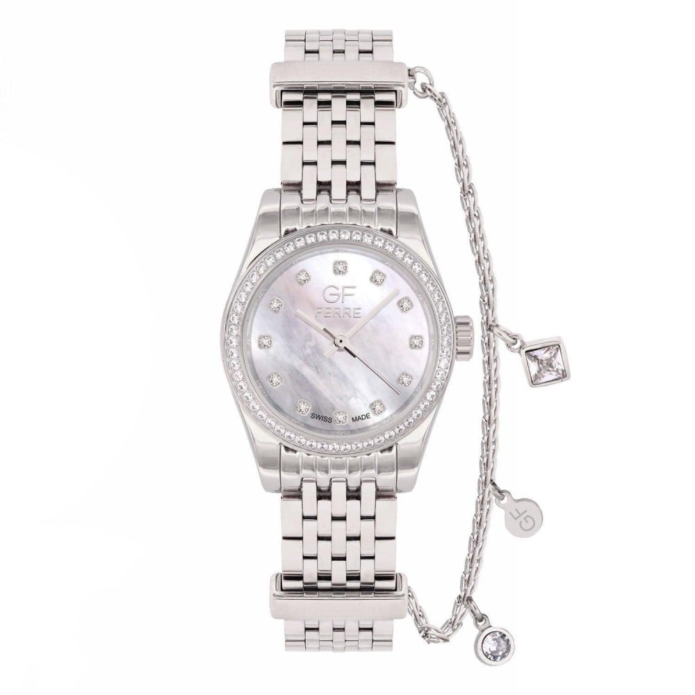 الماركة GF FERRE الموديل GF8073L بلد الصنع صناعة سويسرية الجنس نسائية قطر الاطار 27 ملم اللون فضي لون الميناء صدفي كرونوغراف بدون نوع الاحجار زركون مقاومة الماء 50متر معدن الساعة ستانلس ستيل نوع الحزام ستانلس ستيل