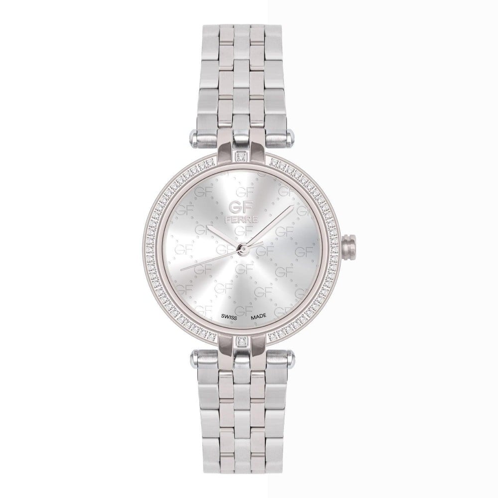 الماركة GF FERRE الموديل GFSS5001 بلد الصنع صناعة سويسرية الجنس نسائية قطر الاطار 30 ملم اللون فضي لون الميناء فضي