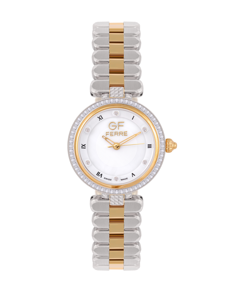 ساعة الماس نسائية أنيقة من ماركة جي إف فيرري السويسرية، اطار مقاس 30 مم مرصع باحجار الالماس ، الساعة مصنوعة من الفولاذ المقاوم للصدأ بدرجة 316L لتوفير المتانة والأناقة. تتميز بمينا كلاسيكي بتصميم الأرقام الرومانية وحزام مبتكر على شكل حلقات يعكس لمسة راقية. الساعة مقاومة للماء حتى عمق 50 مترًا، مما يجعلها مثالية للاستخدام اليومي والمناسبات. تأتي في علبة فاخرة مع تغليف مجاني لتجربة مميزة من البداية.