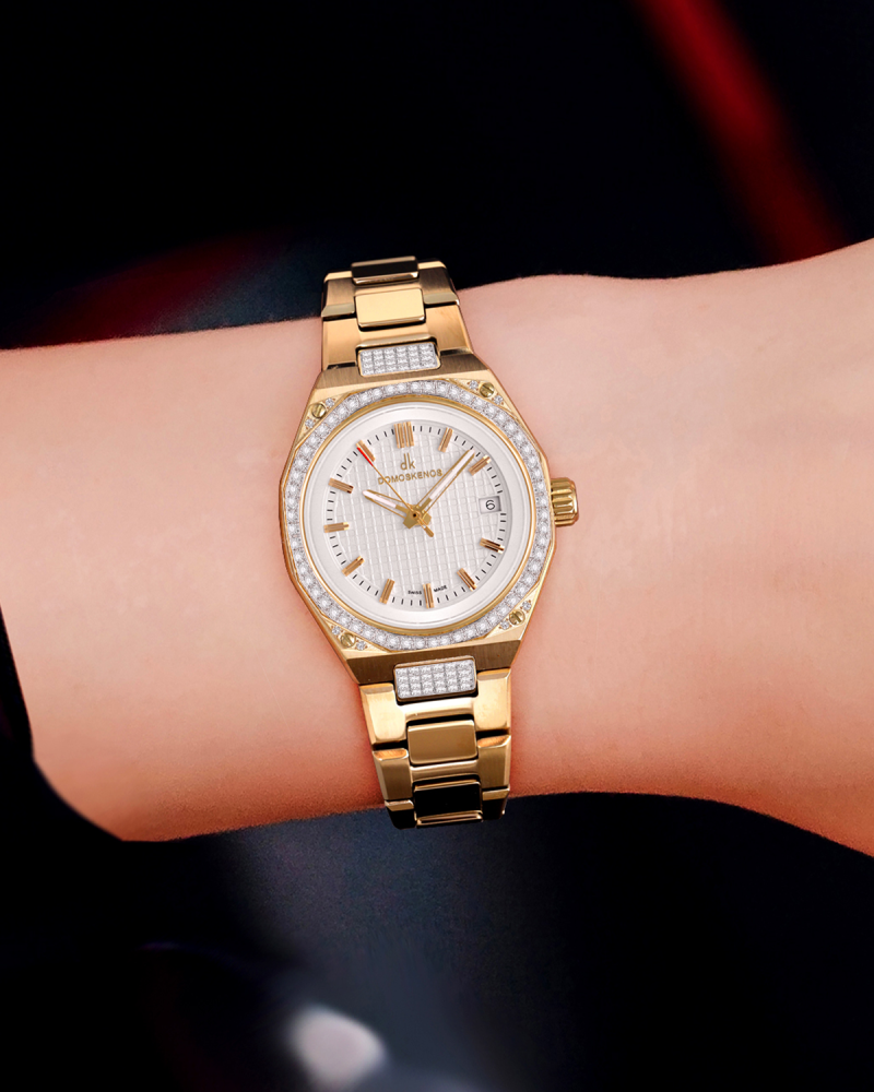 - ساعة نسائية راقية بتصميم هندسي عصري ينبض بالفخامة والدقة السويسرية. تأتي بهيكل مصنوع من الستانلس ستيل المقاوم بدرجة 316L لضمان المتانة واللمعان طويل الأمد. يحيط بالميناء الناعم ذو النقشة الهندسية المربعة إطار دائري أنيق بقطر 28 مم مرصّع بأحجار الألماس البراقة ليمنحها تألقًا استثنائيًا، بينما يزدان السوار الفاخر أيضًا بلمسات من الألماس تضيف بريقًا أنثويًا يعكس الذوق الرفيع. يتوسط الميناء عقارب أنيقة بتفريغات دقيقة تعكس الضوء مع كل حركة، مع نافذة لعرض التاريخ عند موقع الساعة 3. كما أنها مقاومة للماء حتى عمق 30 مترًا، وتُقدَّم في علبة فاخرة مع تغليف مجاني، لتكون هدية مثالية أو قطعة استثنائية لإطلالة متألقة.