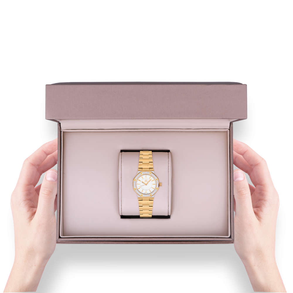 ساعة جي اف فيرري نسائية مرصعة بالالماس صناعة سويسرية ، لاشي يضاهي دقة الوقت في الساعات التي تعمل بحجر الكوارتز ، حجم الاطار 28 مرصع باحجاز الالماس ، مصنوعة بالكامل من الاستانلس ستيل المصقول بعناية ، الحزام ياتي بطبقات جميلة نحت فيها شعار الماركة بشكل جميل ، الميناء مزين بشعار بازر وبترقيم على شكل خطوط بارزه ، تفاصيل الميناء المنحوته تمنح فخامة للساعة ، الساعة تاتي بعلبه فاخرة