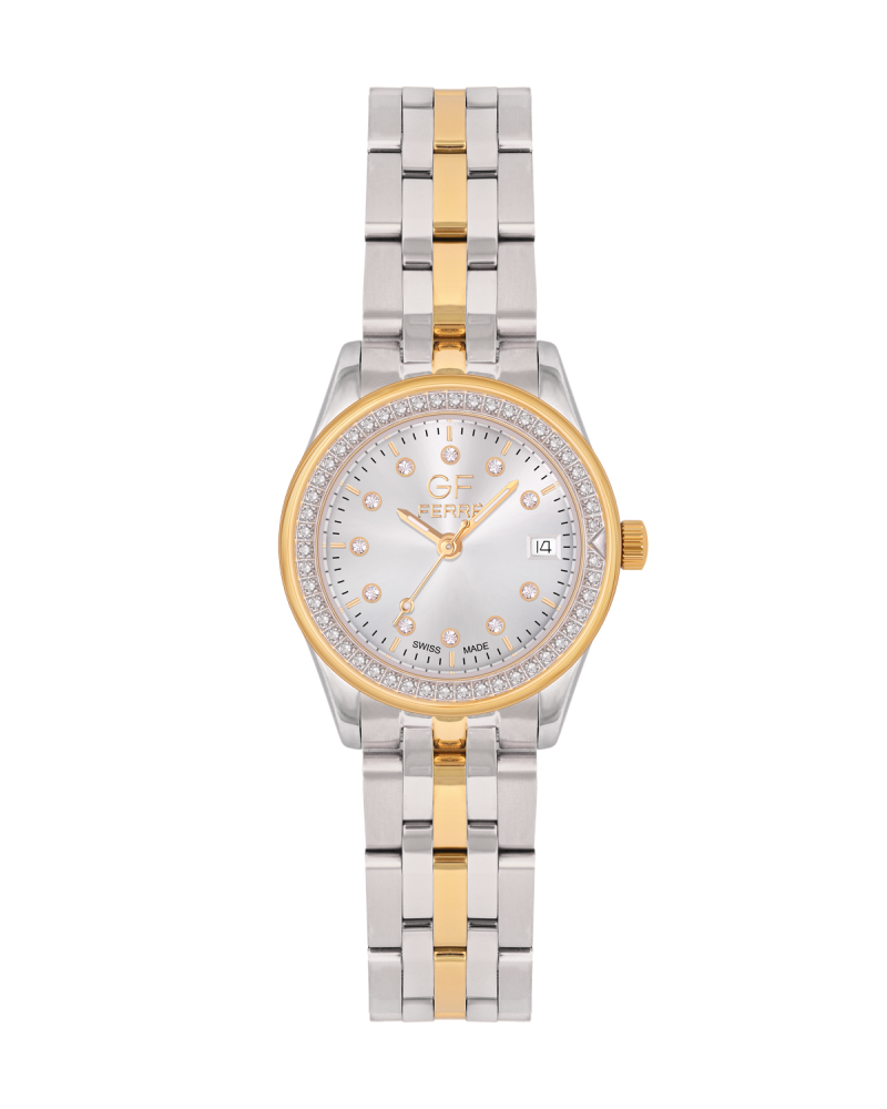 ساعة الماس نسائية ماركة جي اف صناعة سويسرية بلون ذهبي وفضي ، باطار دائري مقاس 28 مم مرصع باحجار الالماس، مينا فضي، بالشعار بارز وانيق ، الغطاء الخلفي ياتي بتفاصيل الساعة بحروف بارزة ، تكمل اناقتها ، الساعة تاتي بعلبة فاخرة وتغليف مجاني