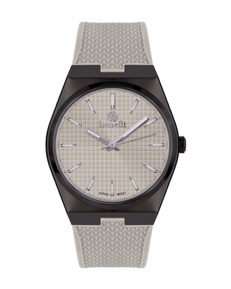 يأتي الإطار بمقاس 39 مم على قاعدة متينة ذات أكتاف منحنية تنساب بسلاسة نحو حزام من الربر العصري، صُمم بلمسات هندسية بارزة ذات نمط شبكي يمنح الحزام ملمسًا مميزًا ومظهراً متجدداً يعكس القوة والحيوية.