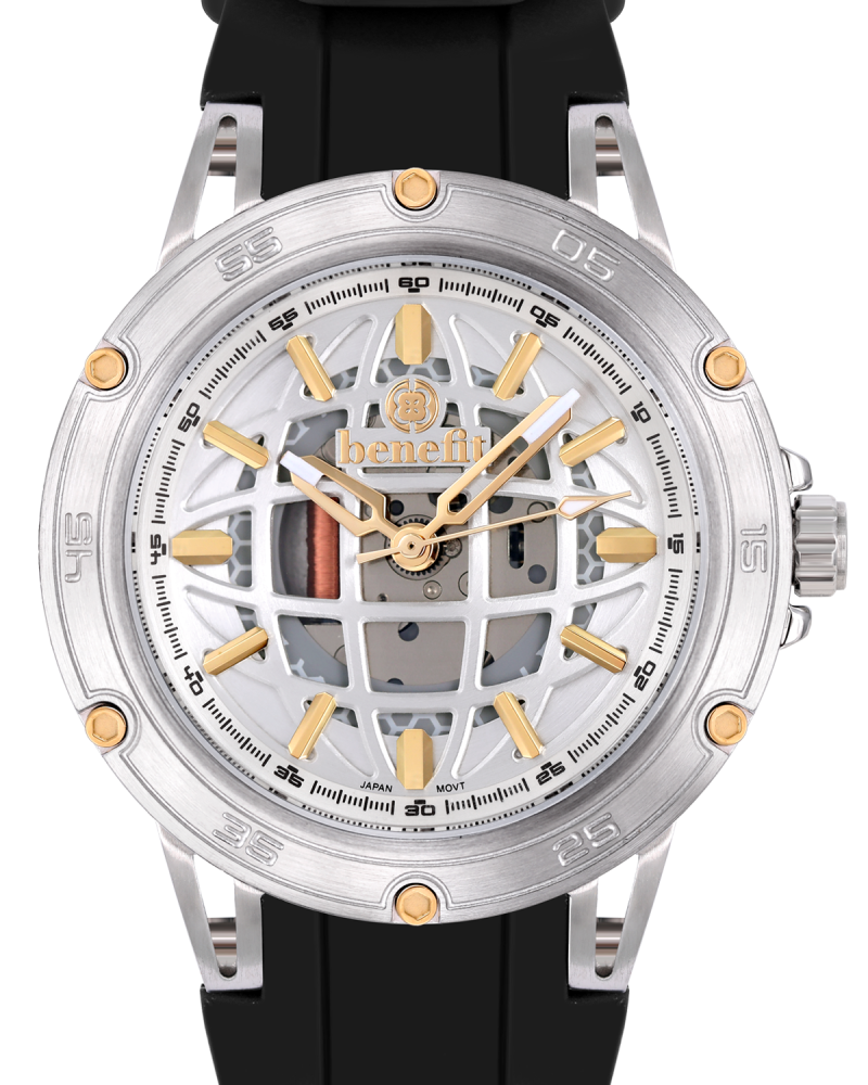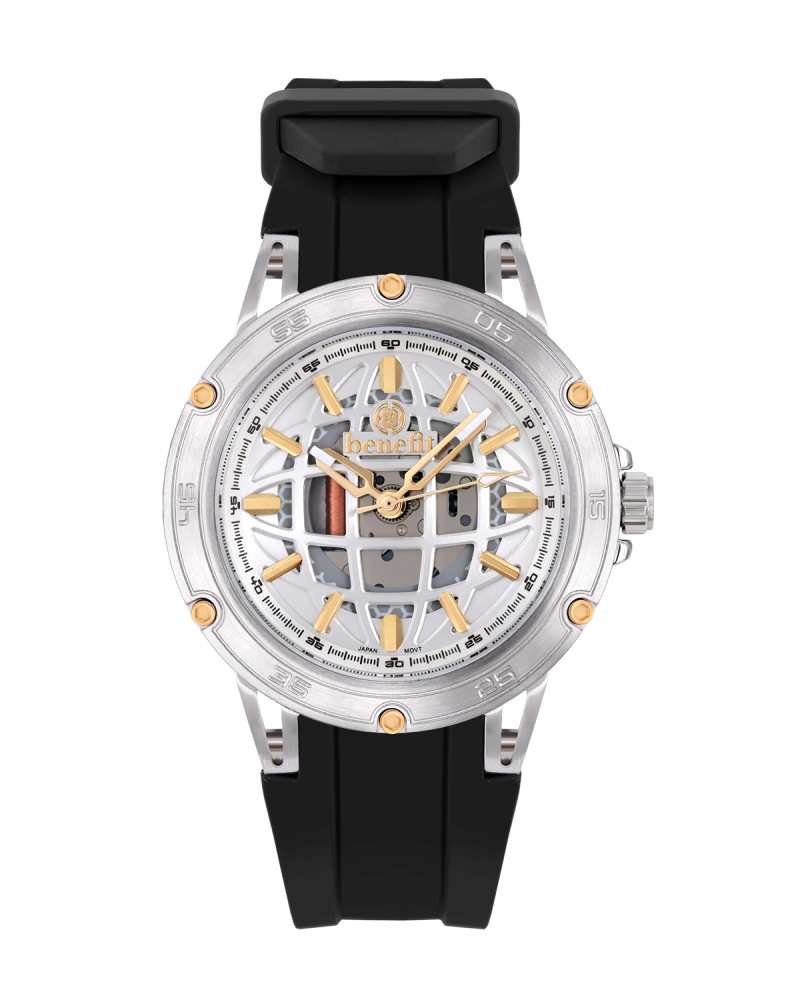 المينا مكشوفة بتصميم Skeleton يتيح رؤية أجزاء الماكينة الداخلية، مع مؤشرات معدنية واضحة باللون المعدني تتناغم مع العقارب اللامعة، ما يضفي إحساساً ميكانيكياً متطوراً ومظهراً مستقبلياً.