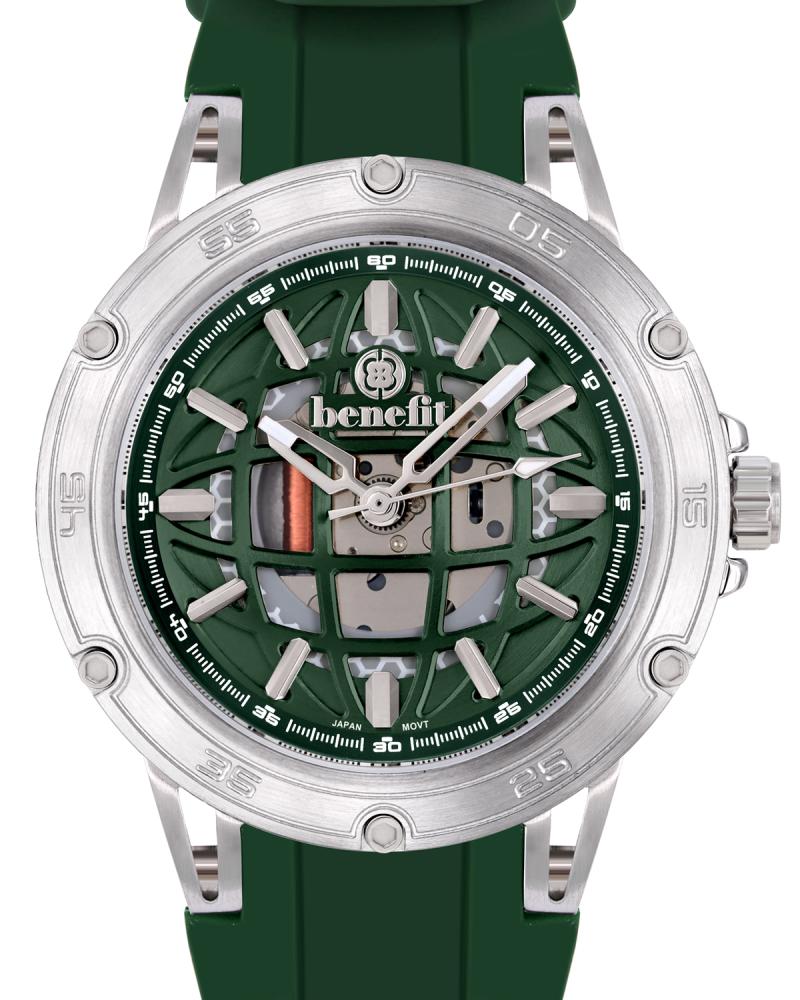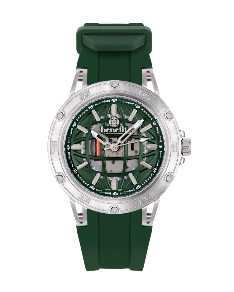 المينا مكشوفة بتصميم Skeleton يتيح رؤية أجزاء الماكينة الداخلية، مع مؤشرات معدنية واضحة باللون المعدني تتناغم مع العقارب اللامعة، ما يضفي إحساساً ميكانيكياً متطوراً ومظهراً مستقبلياً.