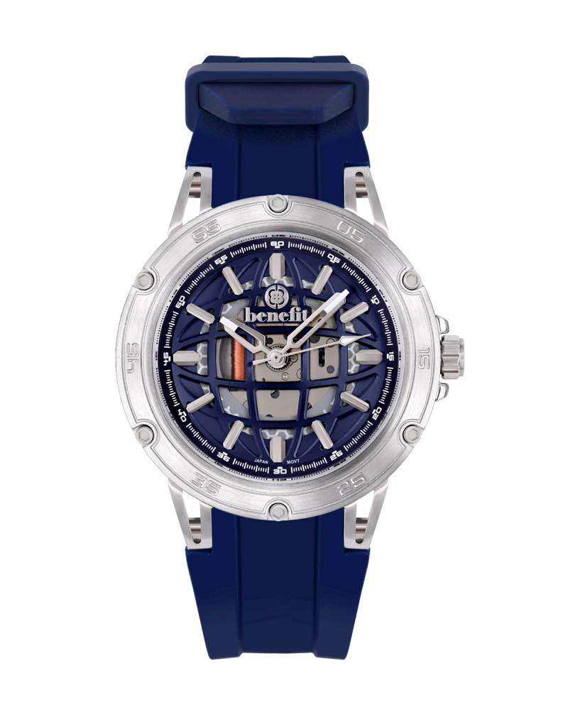 المينا مكشوفة بتصميم Skeleton يتيح رؤية أجزاء الماكينة الداخلية، مع مؤشرات معدنية واضحة باللون المعدني تتناغم مع العقارب اللامعة، ما يضفي إحساساً ميكانيكياً متطوراً ومظهراً مستقبلياً.