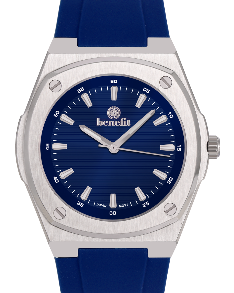 ساعة رجالية أنيقة من ماركة Benefit مصنوعة من الستانلس ستيل المقاوم بدرجة 316L لتمنحك صلابة فائقة ولمسة عصرية راقية. يأتي الإطار بقياس 39 مم بتصميم مضلع متناسق تعلوه حلقة (بزل) مميزة مُثبّتة بأربعة براغٍ زخرفية تمنح الساعة حضورًا هندسيًا جريئًا وإحساسًا بالفخامة المتينة.