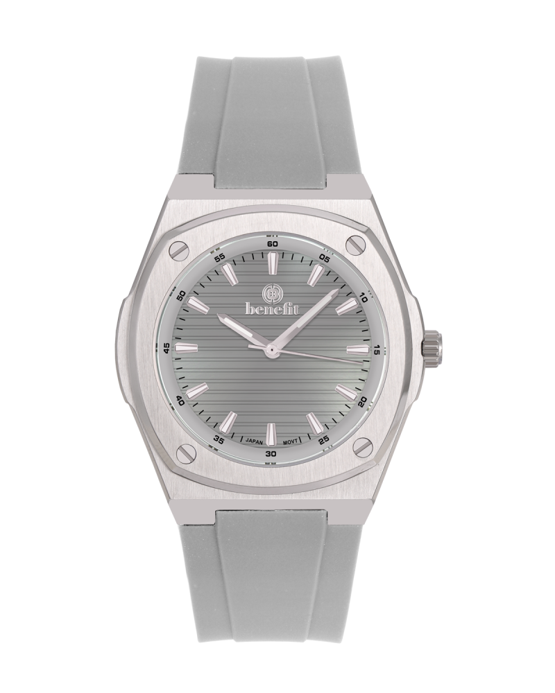 ساعة رجالية أنيقة من ماركة Benefit مصنوعة من الستانلس ستيل المقاوم بدرجة 316L لتمنحك صلابة فائقة ولمسة عصرية راقية. يأتي الإطار بقياس 39 مم بتصميم مضلع متناسق تعلوه حلقة (بزل) مميزة مُثبّتة بأربعة براغٍ زخرفية تمنح الساعة حضورًا هندسيًا جريئًا وإحساسًا بالفخامة المتينة.