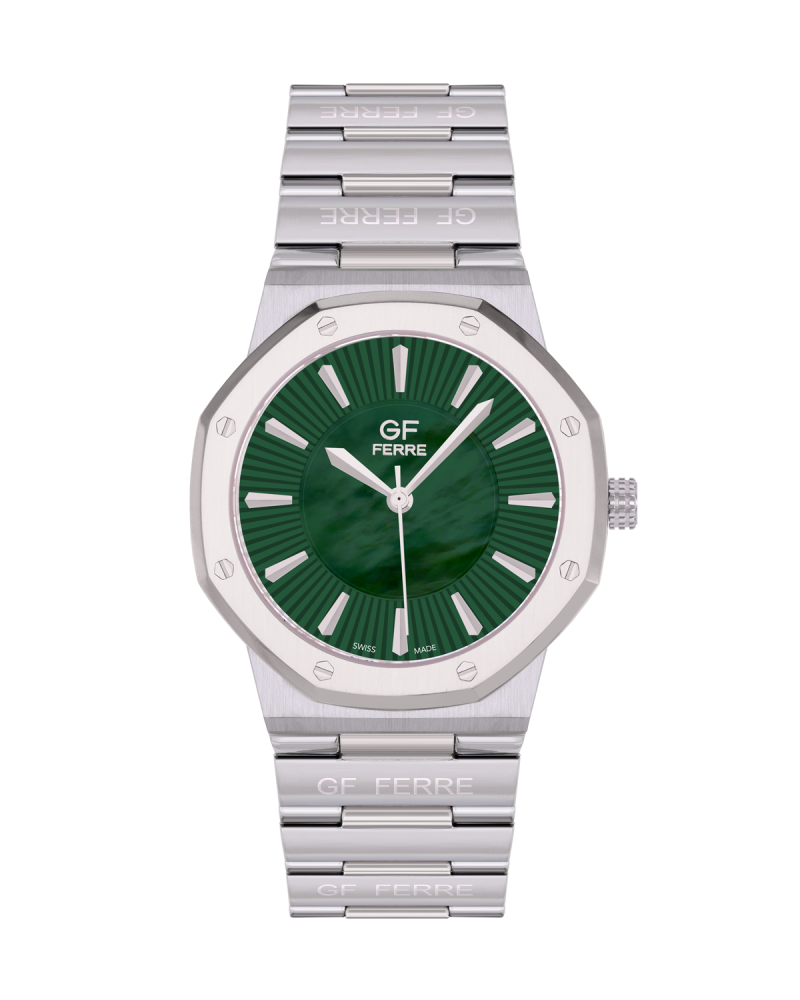 ساعة رجالية ماركة جي اف فضي مينا اخضر موديل GF170175G