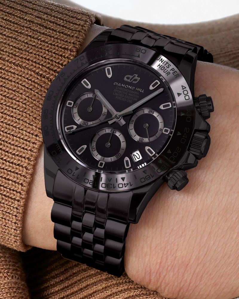 - يحمي المينا زجاج كريستال K1 المقاوم للخدش، وتعمل الساعة بماكينة كرونوغراف يابانية عالية الأداء تليق بالمحترفين. السوار المعدني الأسود يلتف حول معصمك ليكمل الإطلالة القوية، مع مقاومة للماء حتى 50 مترًا. تأتي الساعة في علبة فاخرة مع تغليف مجاني… لأنك ببساطة لا تقبل بأقل من الكمال.