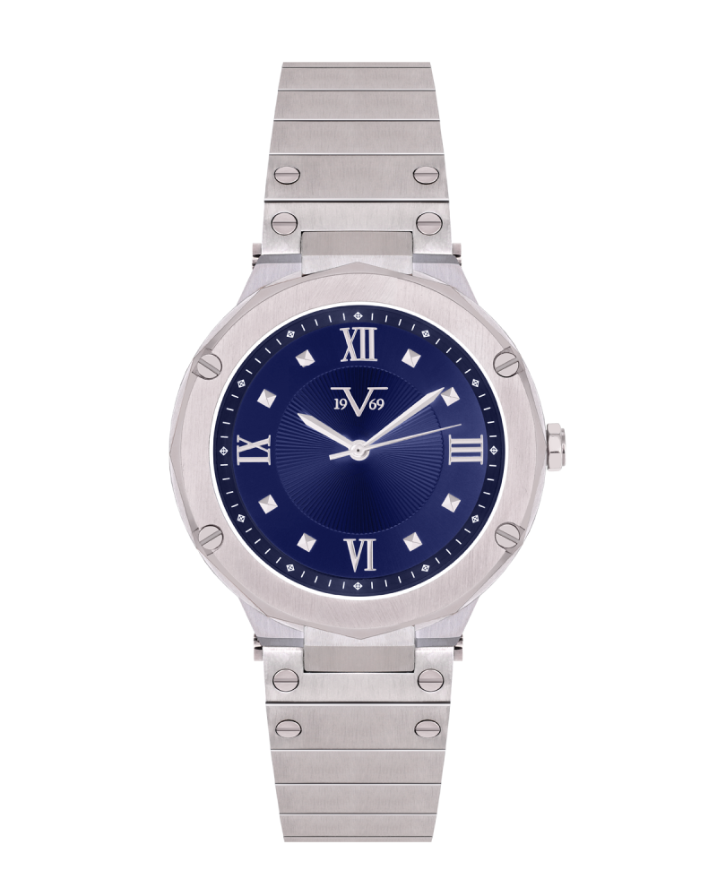اكتشف الأناقة الإيطالية الفاخرة مع ساعة V19.69 الرجالية المصنوعة من الاستانلس ستيل المقاوم، بتصميم يجمع بين القوة والتميز. يتميز الإطار الدائري بقاعدة مضلعة بحجم 40 مم، مما يمنح الساعة حضوراً رجولياً يعكس شخصية قوية. أما السوار والإطار، فقد زُينا بلمسات السكروز الأنيقة التي تضيف لمسة عصرية جذابة.