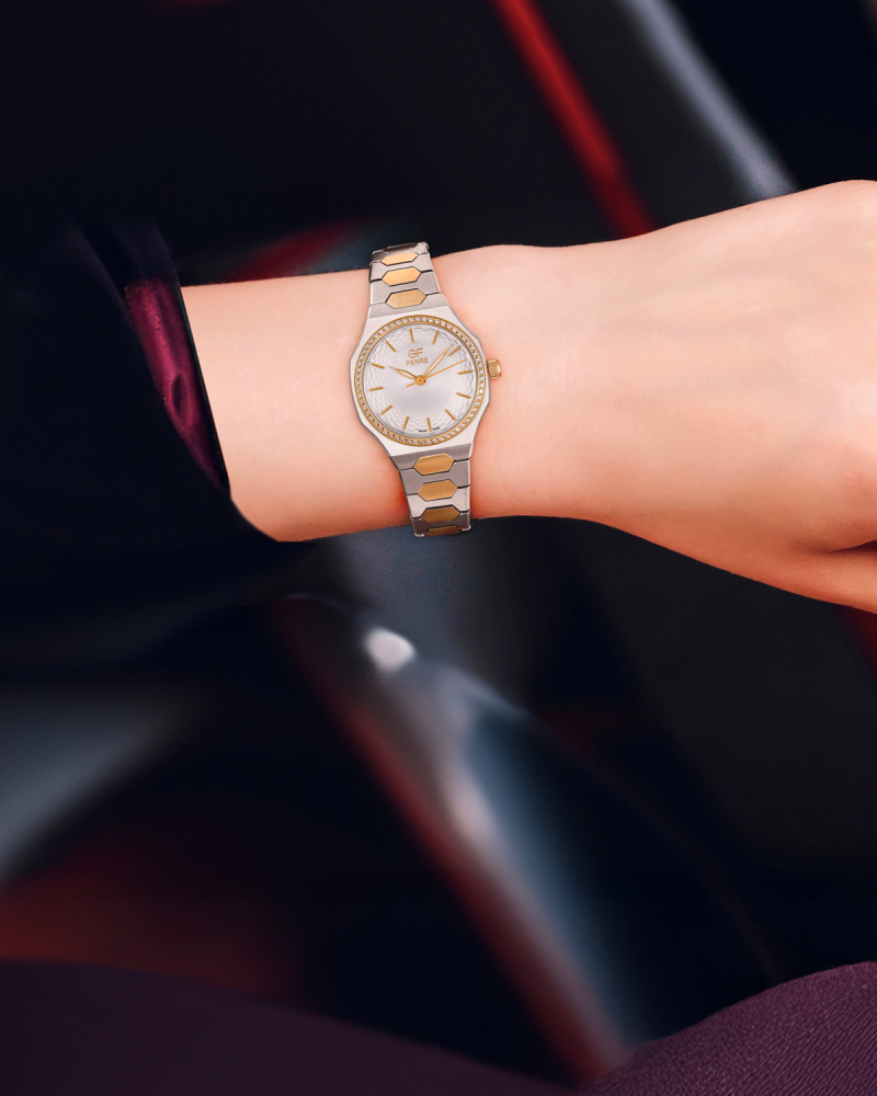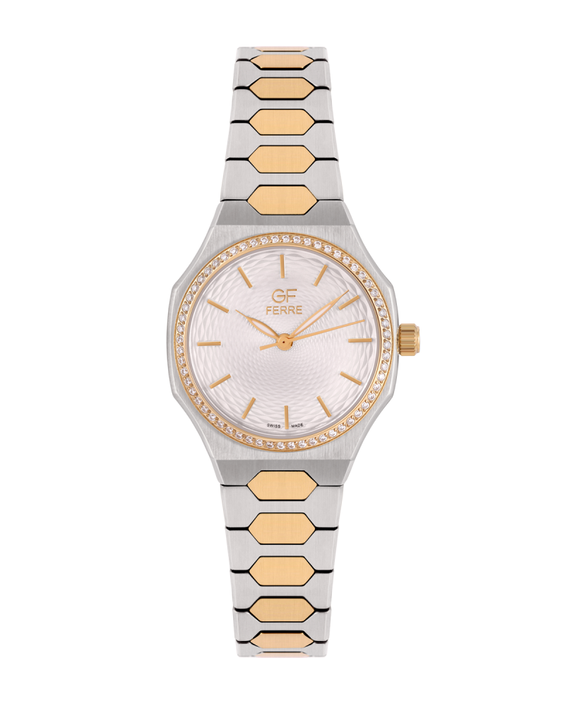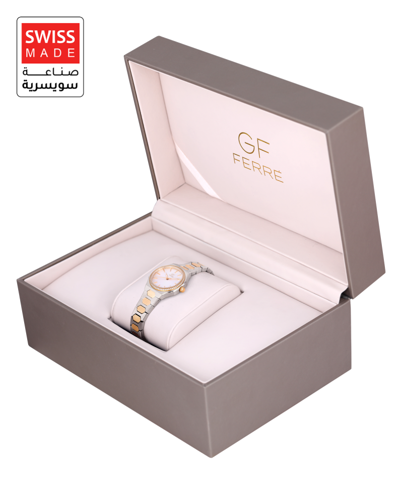 اكتشفي أناقة التصميم ودقة الصناعة مع هذه الساعة النسائية من ماركة GF Ferre، المصنوعة في سويسرا من الاستانلس ستيل الفاخر بدرجة 316L لمتانة تدوم. يأتي الإطار الدائري بحجم 28 مم، مرصعًا بأحجار الزركون البراقة، ومثبت على قاعدة مضلعة تمنحه طابعًا معماريًا فخمًا.