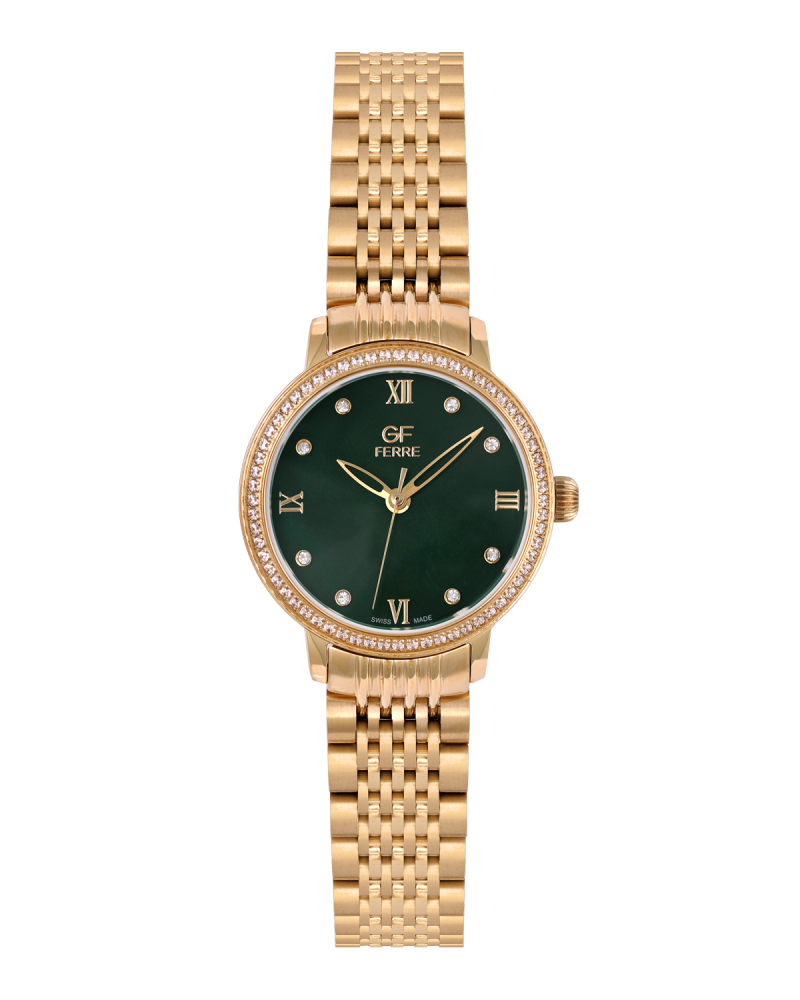 ساعة نسائية صناعة سويسرية ماركة جي اف فيرري ذهبي ميناء اخضر GFGPW2177