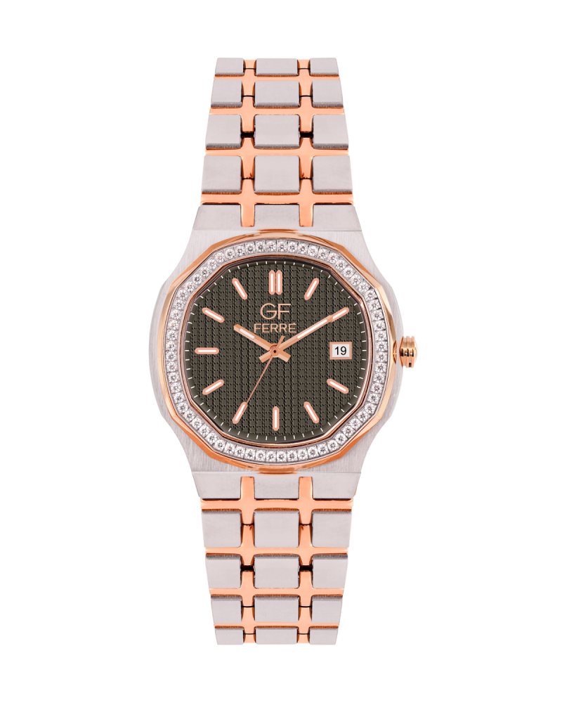 تجسّد هذه الساعة النسائية من ماركة جي إف فيرري قمة الأناقة الهندسية والدقة السويسرية، بتصميم راقٍ يعكس الذوق العصري الرفيع. تأتي الساعة بهيكل مصنوع من الفولاذ المقاوم للصدأ بدرجة 316L، وهو من أعلى درجات الجودة في عالم الساعات الفاخرة. يتميز الإطار المضلع الفريد بقياس 28 مم، ومرصّع بدقة بأحجار الزركون المتلألئة على قاعدة منحنية بزاوية هندسية تضيف بُعداً بصرياً فاخراً.