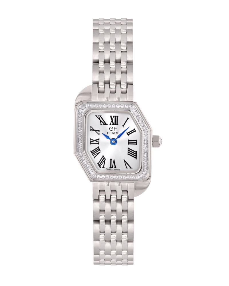 ساعة نسائية فاخرة من ماركة جي إف فيرري، تتميز بتصميم أنيق يعكس الرقي والجودة السويسرية. مصنوعة من الاستانلس ستيل المقاوم بدرجة 316L، مع إطار هندسي فريد مستوحى من متوازي الأضلاع، مقاس 22-24 مم ومع الاكتاف 22-30 مم مرصع بأحجار الزركون النقية التي تضيف بريقًا ساحرًا.