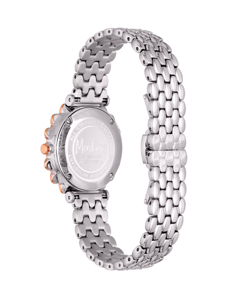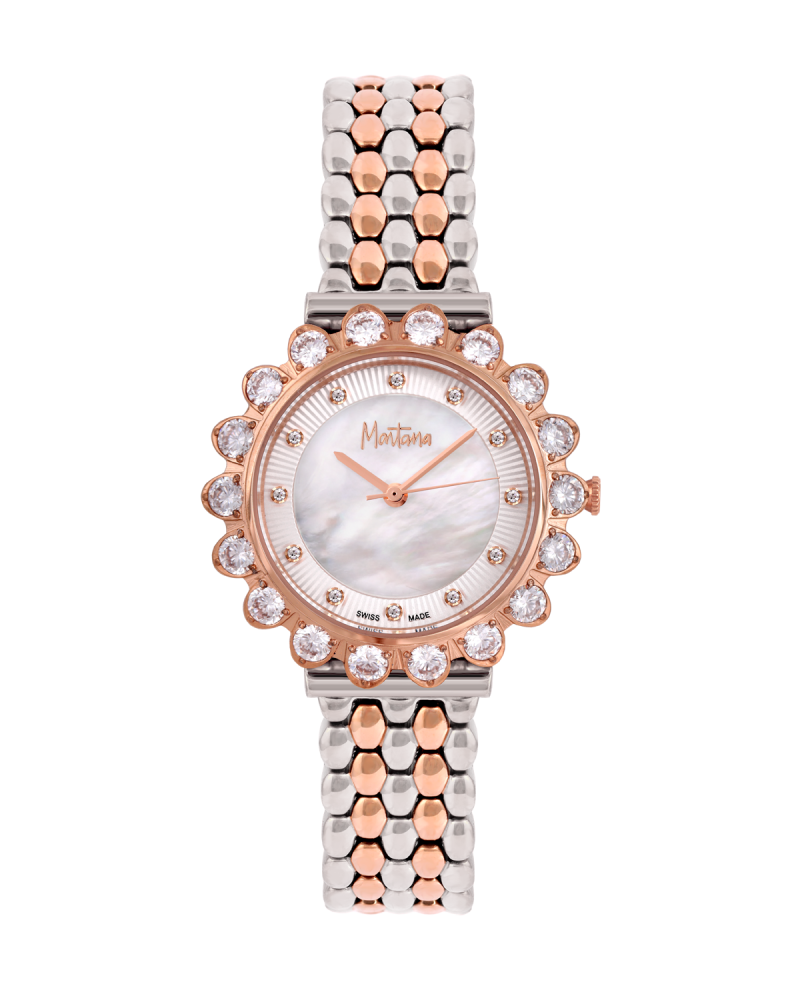 اكتشفي روعة الأناقة السويسرية مع ساعة مونتانا النسائية. تصميم فاخر بإطار مقاس 33 مم مصنوع من الاستانلس ستيل المقاوم، مرصع بأحجار الزركون البراقة ليمنحك لمسة من التميز. تأتي الساعة بحزام من الاستانلس ستيل مرصع باحجار الزركون . الساعة مقاومة للماء لتناسب جميع أوقاتك، وتصل إليك في علبة فاخرة مع تغليف مجاني يعكس جمال الاختيار.