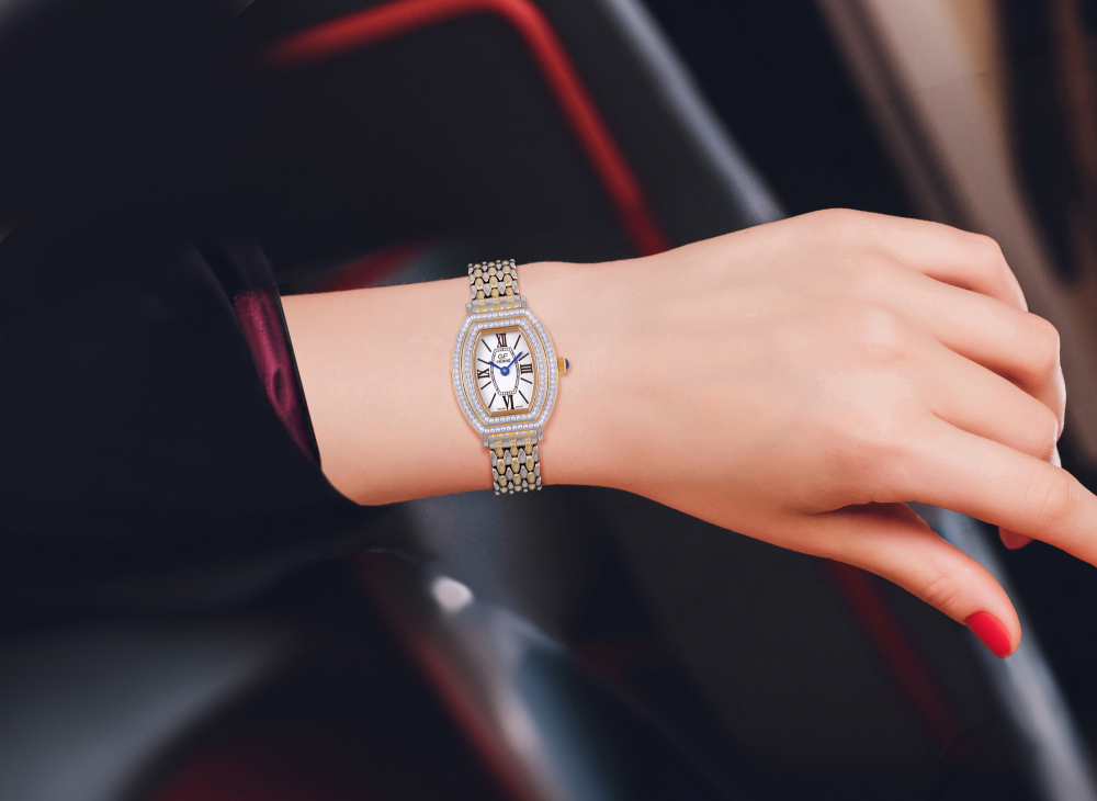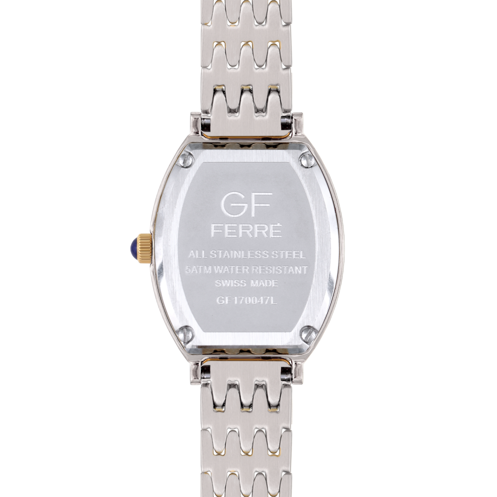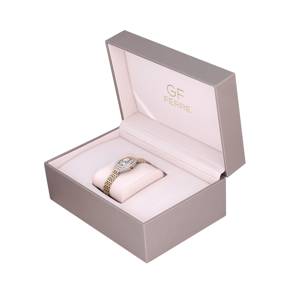 ساعة نسائية ماركة جي اف فيرري سويسرية الصنع من الاستانلس ستيل بإطار مستطيل بيضاوي يمنحها شكلاً كلاسيكياً فريداً. الإطار مرصع بطبقتين من أحجار الزركون النقية، مما يضيف لمسة من الفخامة واللمعان. تتميز بمينا بتصميم راقي وأنيق، مع ترقيم روماني واضح وجذاب. الساعة مقاومة للماء حتى خمسين متراً، مما يجعلها مناسبة للاستخدام اليومي والأنشطة المختلفة. تأتي الساعة في علبة فاخرة مع تغليف مجاني، مما يجعلها هدية مثالية لأي مناسبة