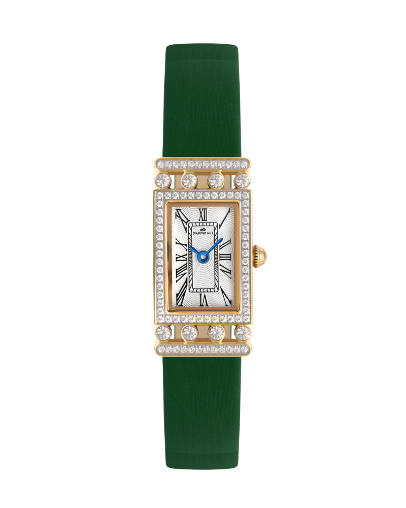 ساعة نسائية بتصميم فاخر مستوحى من الطراز الكلاسيكي مع لمسة عصرية تفيض بالرقي. تأتي الساعة بهيكل مستطيل بمقاس 29×15 مم، مرصّع بالكامل بأحجار الزركون البراقة التي تزين الإطار والحواف بطريقة متناغمة تلفت الأنظار.