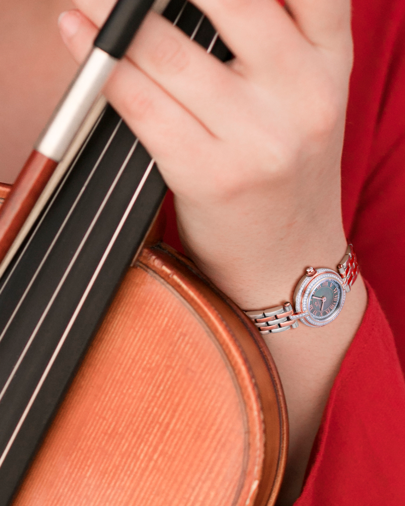ساعة دايموند هيل النسائية الفاخرة تمثل جوهرة سويسرية أنيقة تجمع بين الحرفية العالية والتصميم الراقي. تتميز هذه الساعة بهيكل مصنوع بالكامل من الفولاذ المقاوم للصدأ، مما يمنحها مظهراً براقاً ومتانة لا تضاهى. إطار الساعة الرقيق بمقاس 23 ملم مزين بخطين مزدوجين من أحجار الزركون اللامعة، مما يضفي عليها لمسة من الفخامة والأناقة.