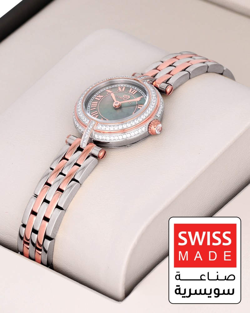 • ساعة دايموند هيل النسائية الفاخرة • صناعة سويسرية بجودة عالية • هيكل من الفولاذ المقاوم للصدأ بالكامل • إطار رقيق بمقاس 23 ملم • مرصعة بخطين مزدوجين من أحجار الزركون • مينا صدفي بأرقام رومانية • مقاومة للماء حتى 50 متراً • تأتي في علبة فاخرة • تغليف مجاني لكل عملية شراء