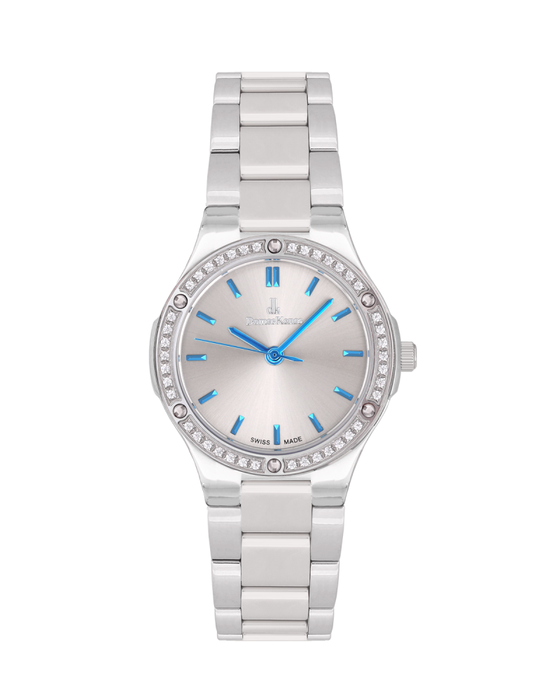 ساعة نسائية فاخرة من ماركة دوموسكينوس، مصنوعة في سويسرا من الاستانلس ستيل بالكامل. تتميز بإطار مرصع بأحجار الزركون بمقاس 28 ملم ومزين بثمانية مفاتيح. مقاومة للماء حتى 50 متراً، وتأتي في علبة فاخرة مع تغليف مجاني، لتكون الخيار المثالي للسيدة الأنيقة.