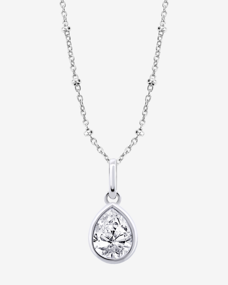 عقد أنيق باللون الفضي مع لمسة نهائية لامعة، مرصّع بحجر زركون أبيض فاخر يمنحك إشراقة أنثوية مميزة.