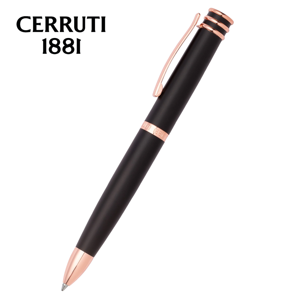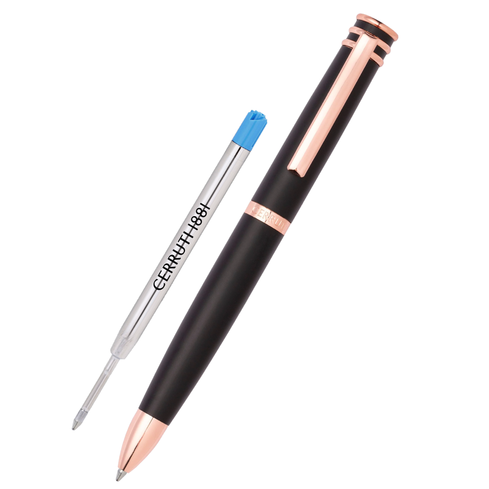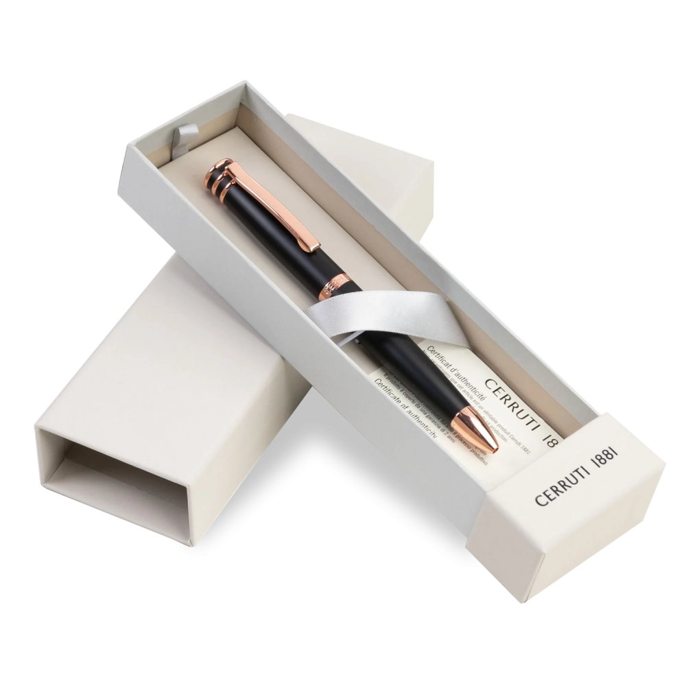 قلم "أوستن" ماركة شيروتي مبني على واحدة من أكثر التصاميم الأيقونية لدى سيروتي: الحلقة العلوية. في هذا الإصدار الجديد، نحن نلعب بالسطح غير اللامع للجسم المزخرف بزخارف معدنية مطلية بشكل جميل. هذا الإصدار باللونين الأسود والذهبي الوردي هو مثال للأناقة الخالدة.