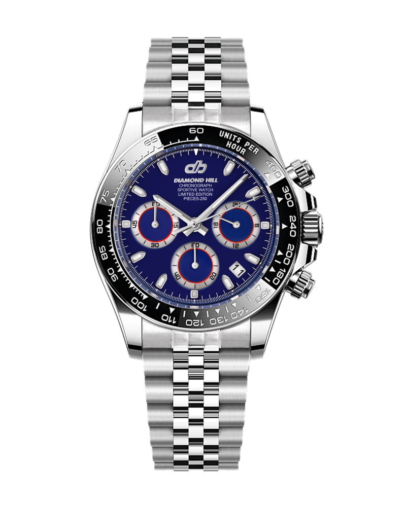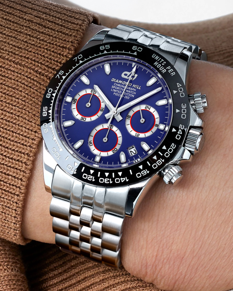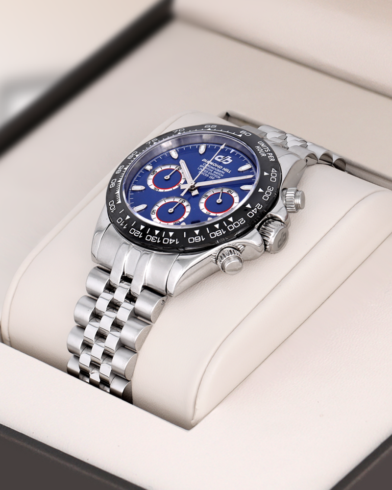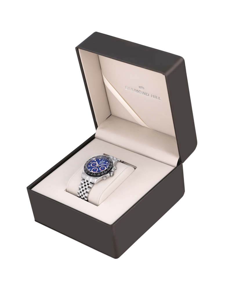 ساعة دايموند هيل الرجالية تأتي هذه المرة بإطلالة رياضية فاخرة تنبض بالقوة والأناقة، مصنوعة من الاستانلس ستيل المقاوم للصدأ بدرجة 316L لتمنحك صلابة تدوم لسنوات. إطارها بقياس 40 مم مزود بحافة سوداء أنيقة تحمل ترقيم تاكيميتري محفور بدقة لقياس السرعات، فيما تمنحك المفاتيح الجانبية تحكمًا سلسًا بوظائف الكرونوغراف.